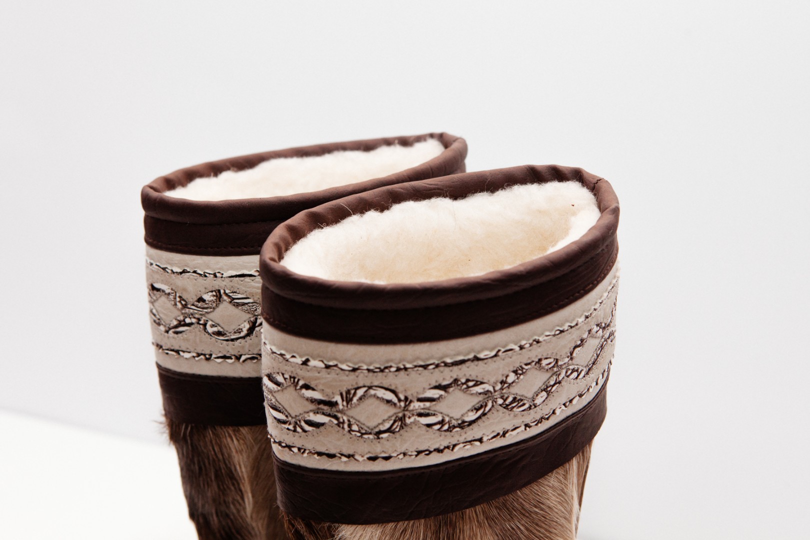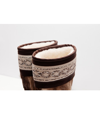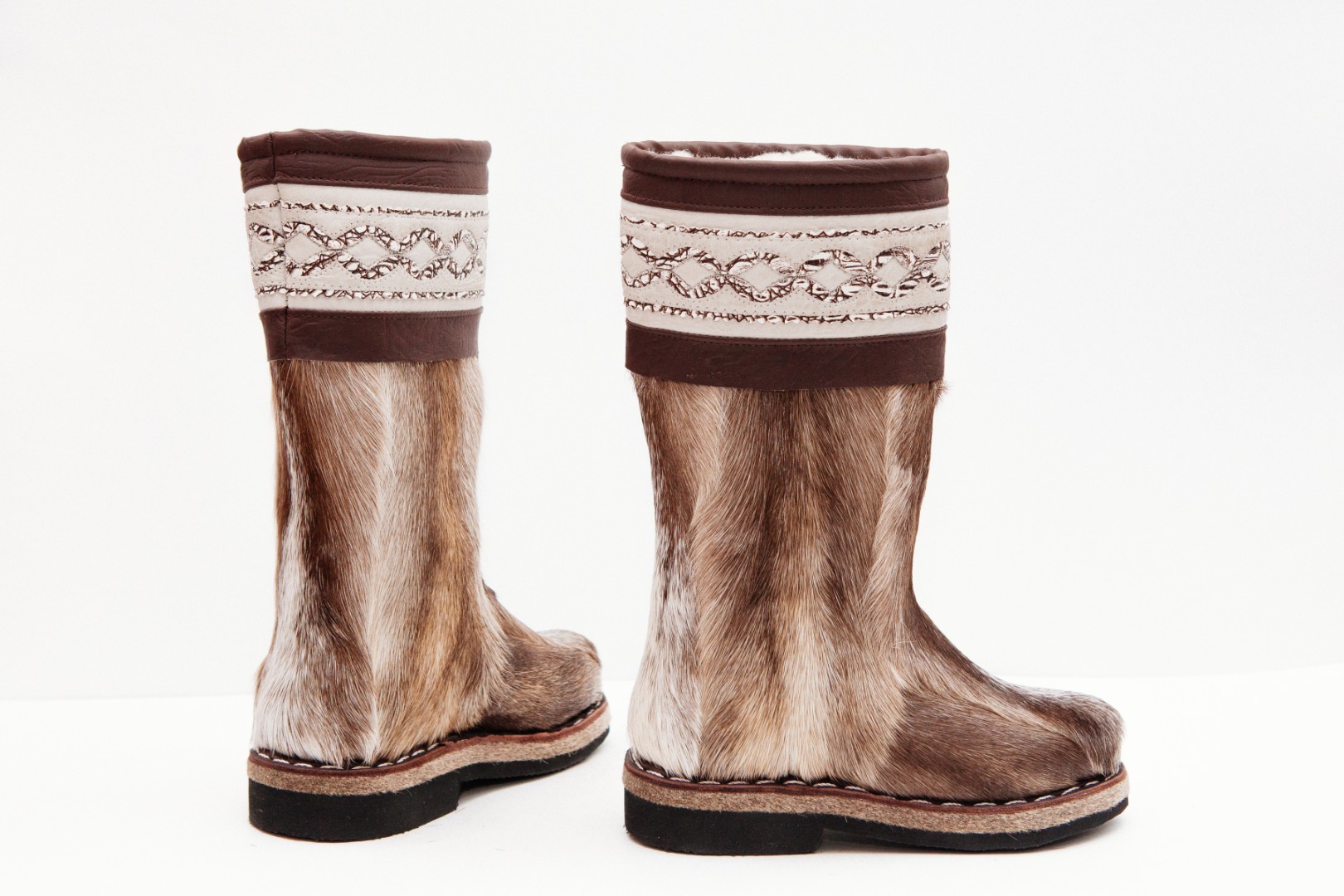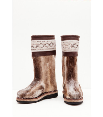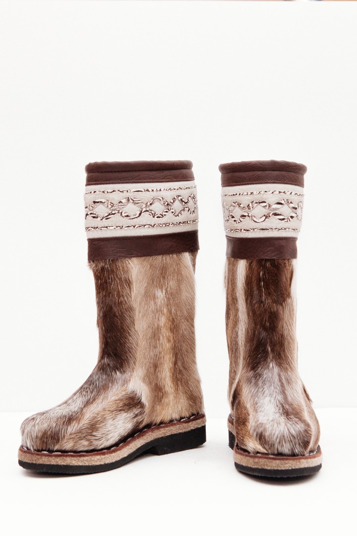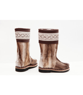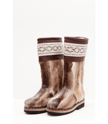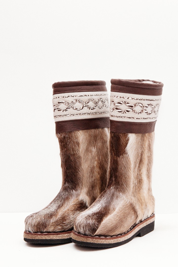 Унты из камуса северного оленя с кожаным ободком, вышитым ручным узором.