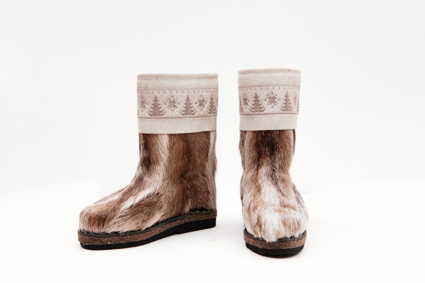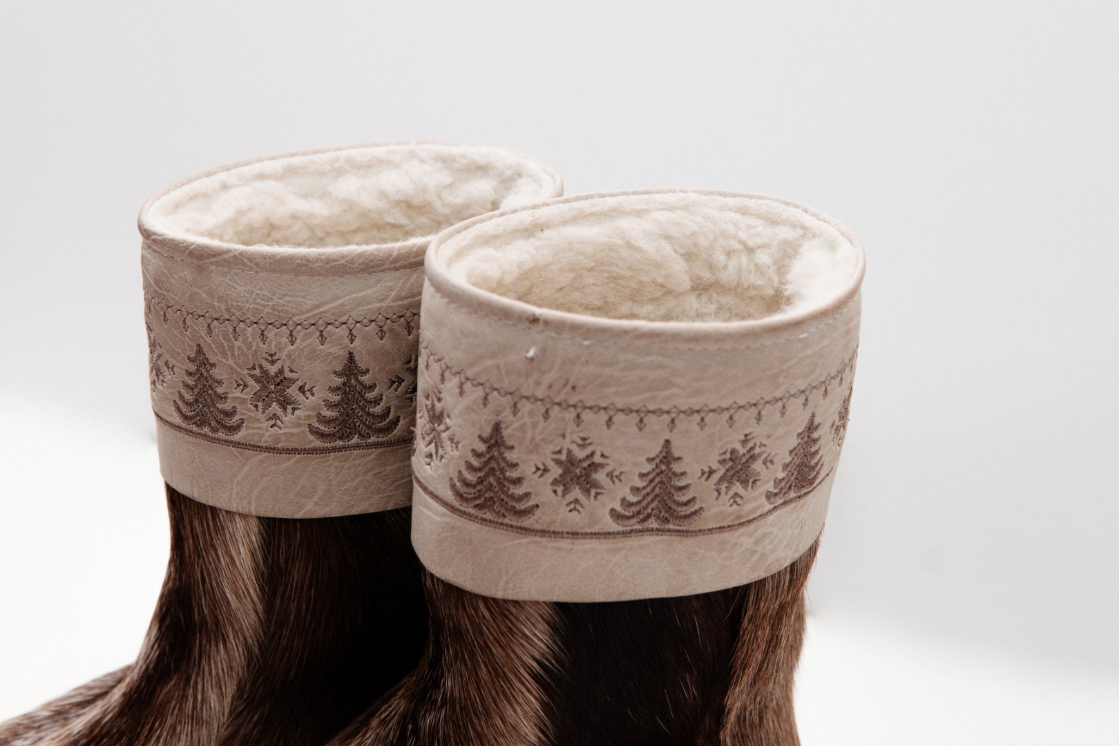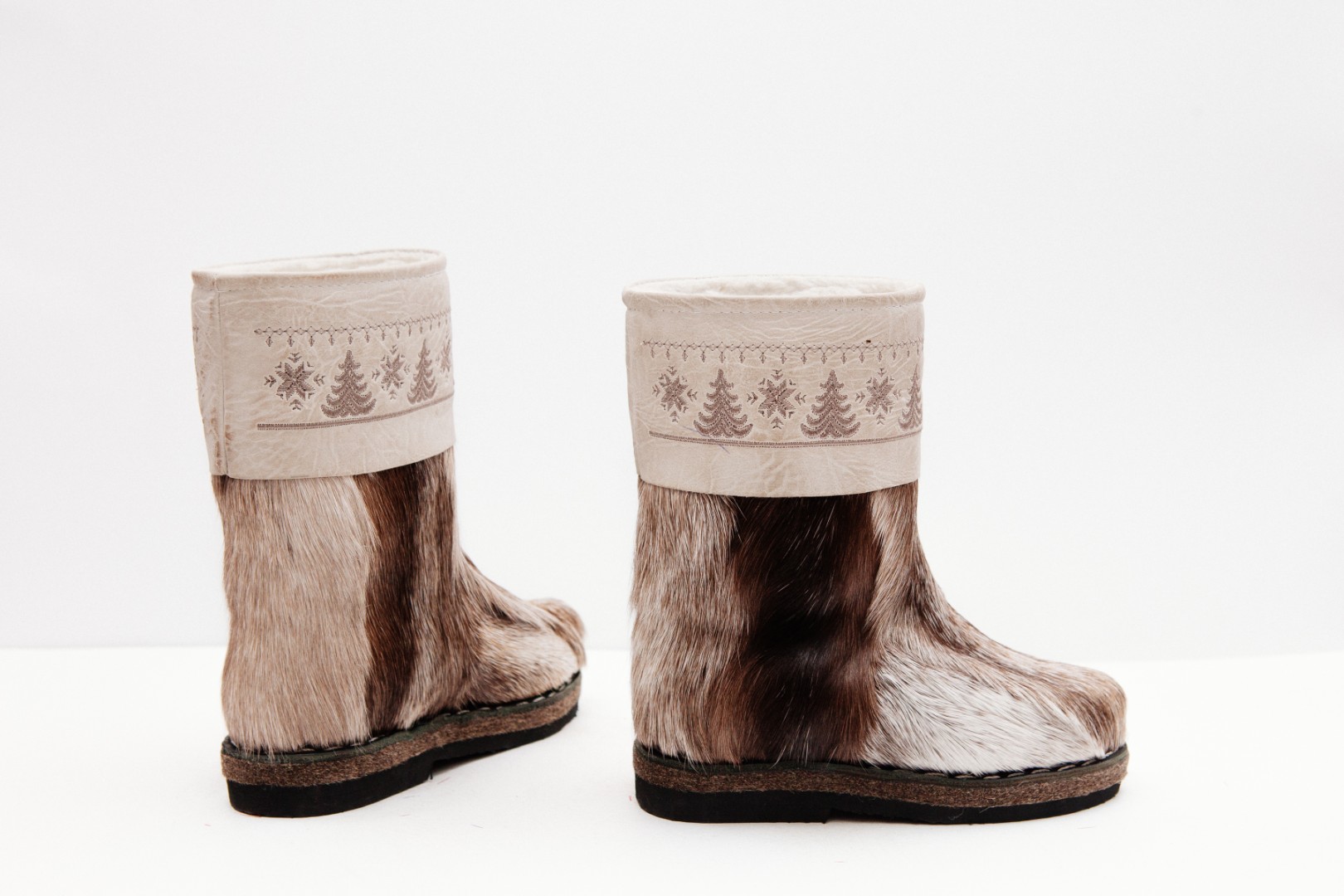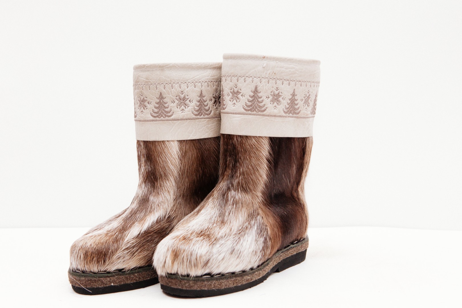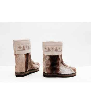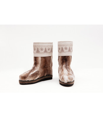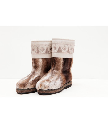 Унты из камуса северного оленя с кожаным ободком, вышитым ручным узором.