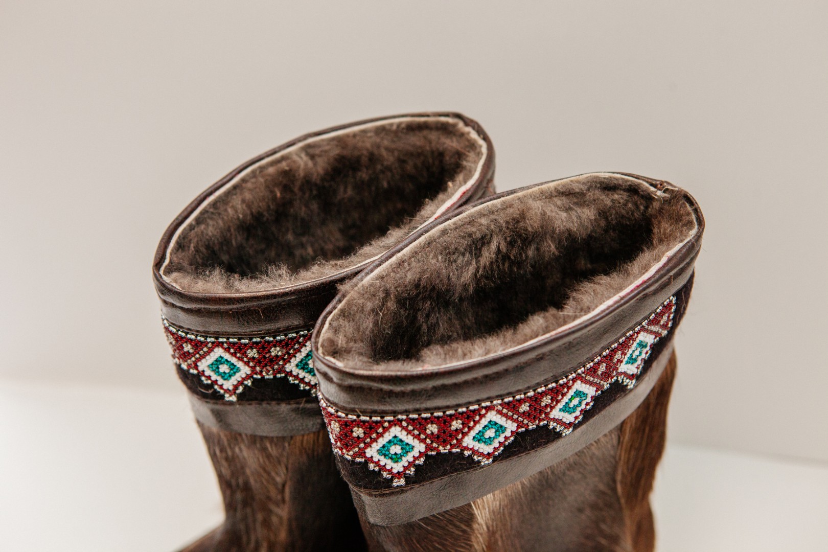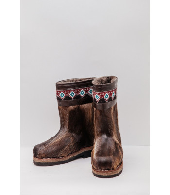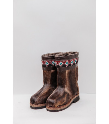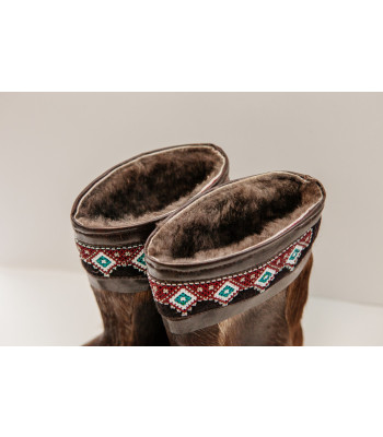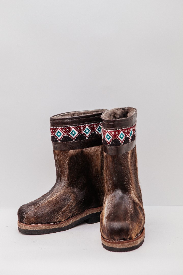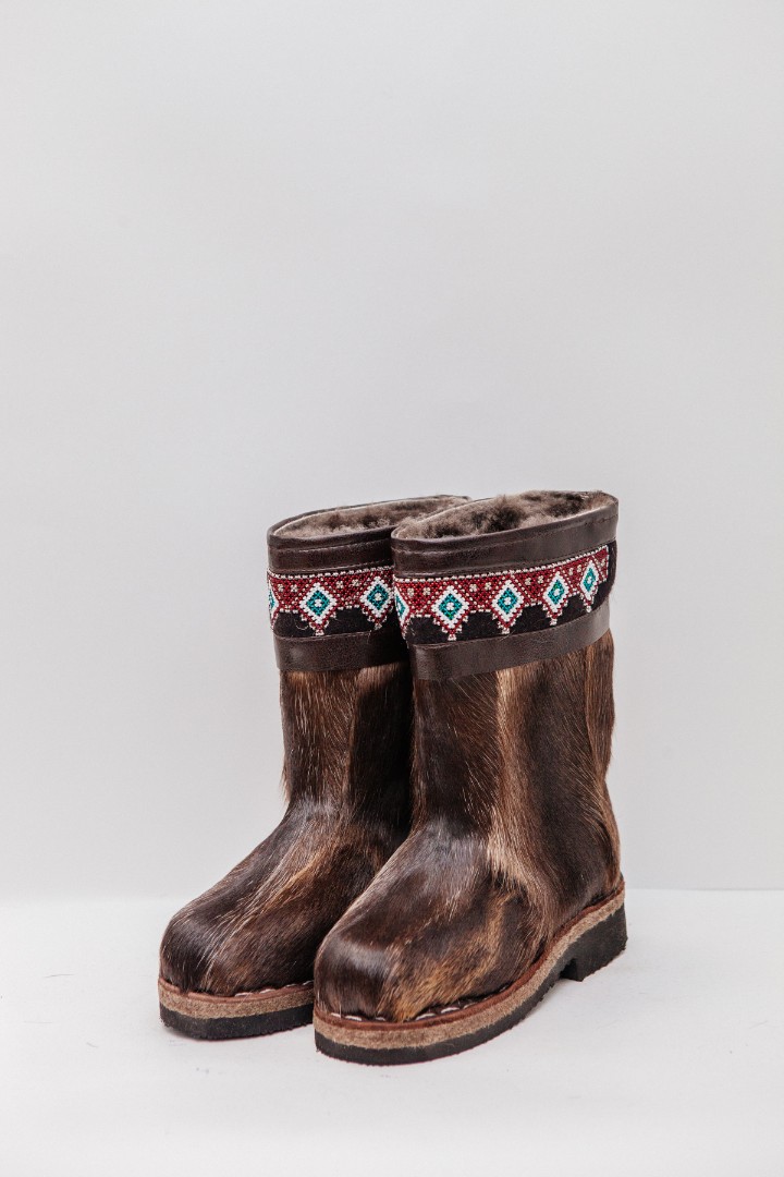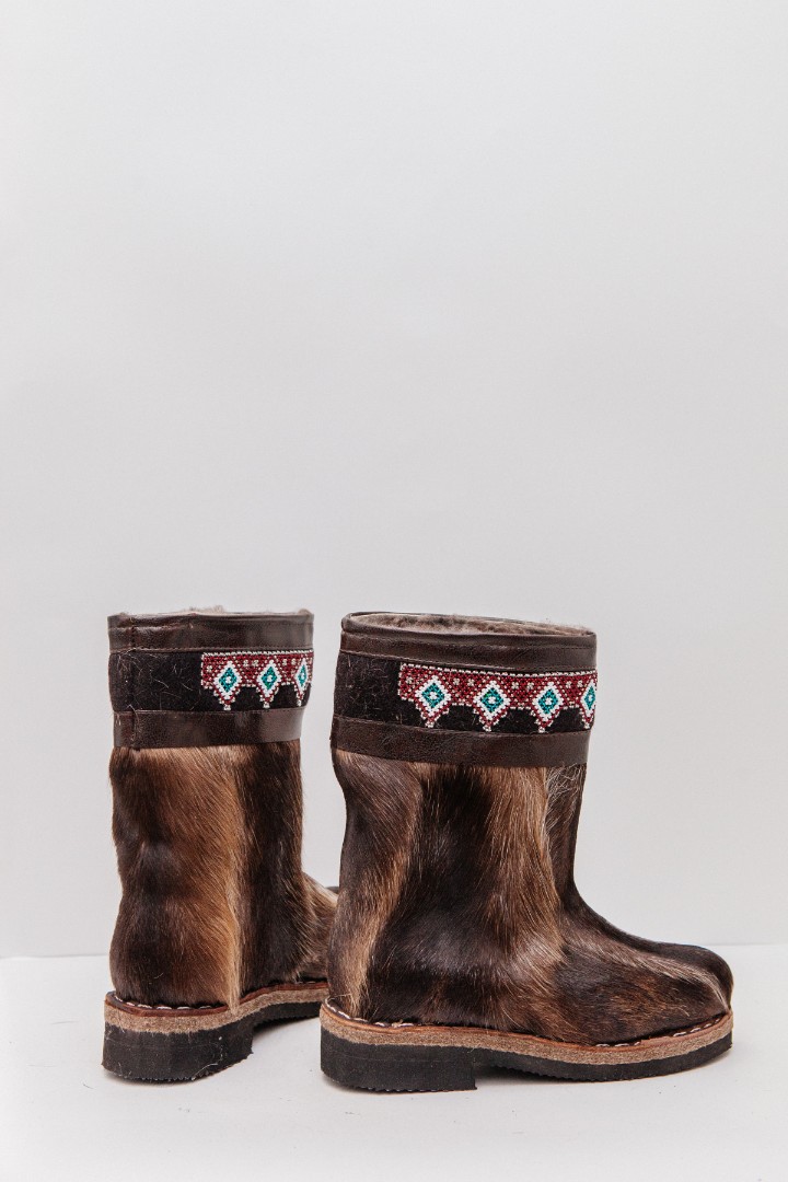 Унты из камуса северного оленя с кожаным ободком, вышитым ручным узором.