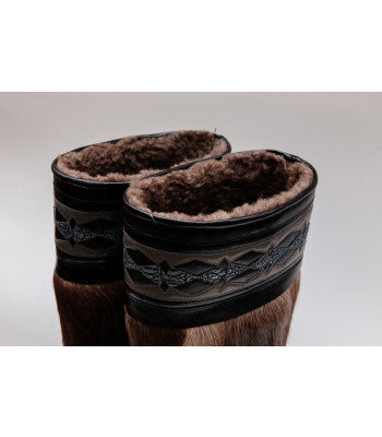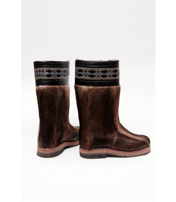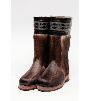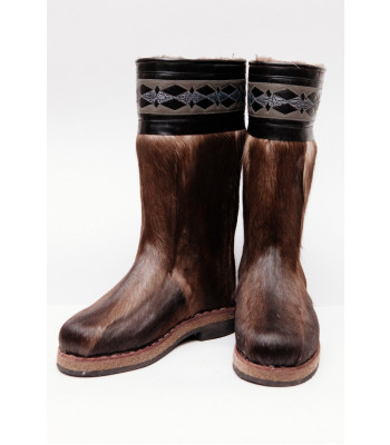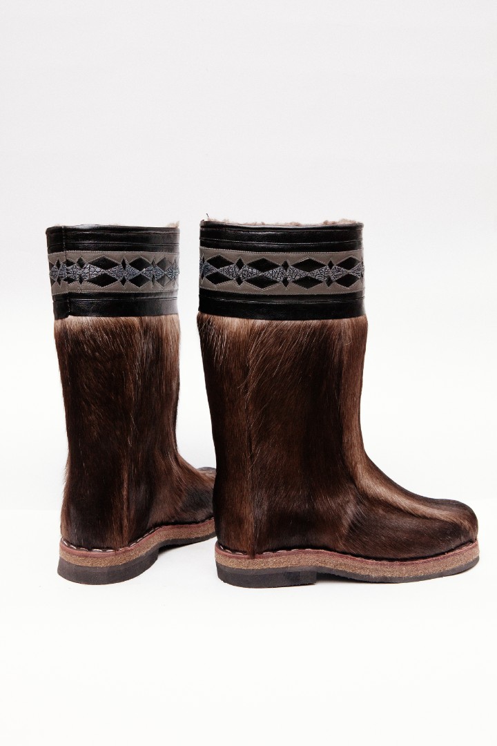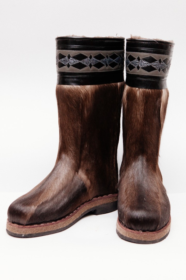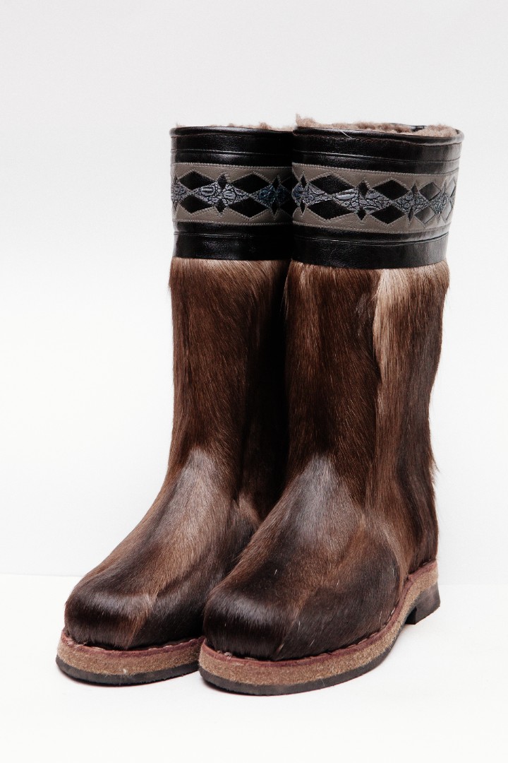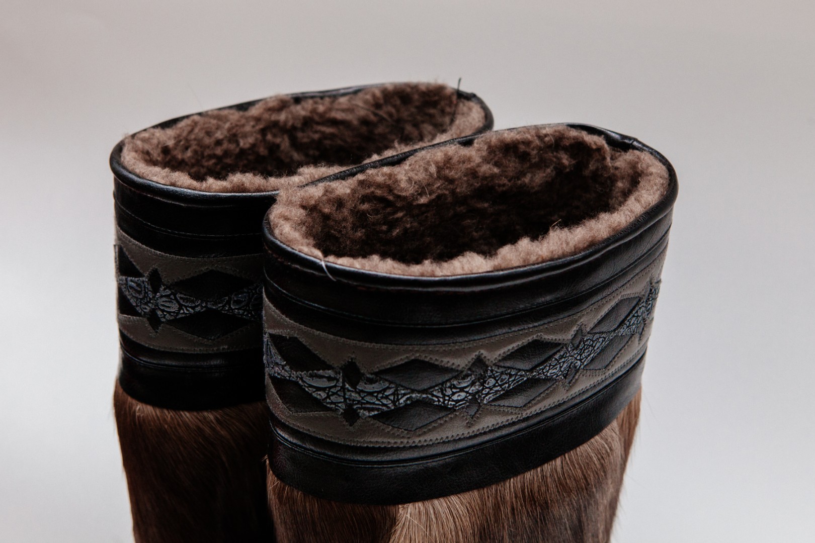 Унты из камуса северного оленя с кожаным ободком, вышитым ручным узором.