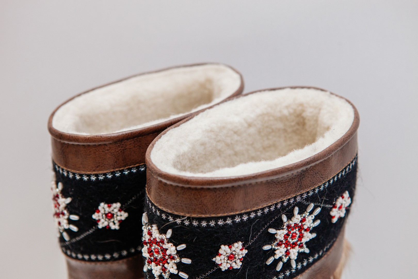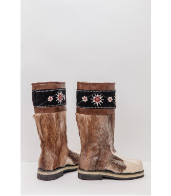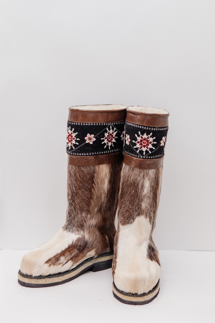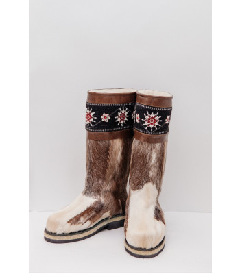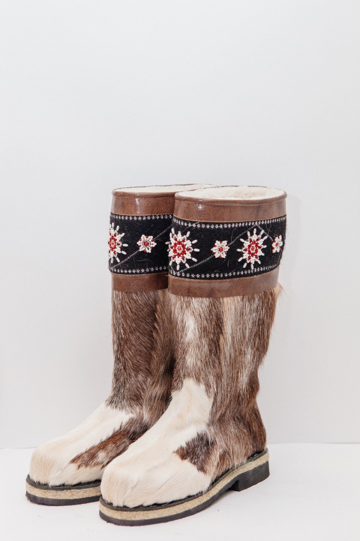 Унты из камуса северного оленя с кожаным ободком, вышитым ручным узором.