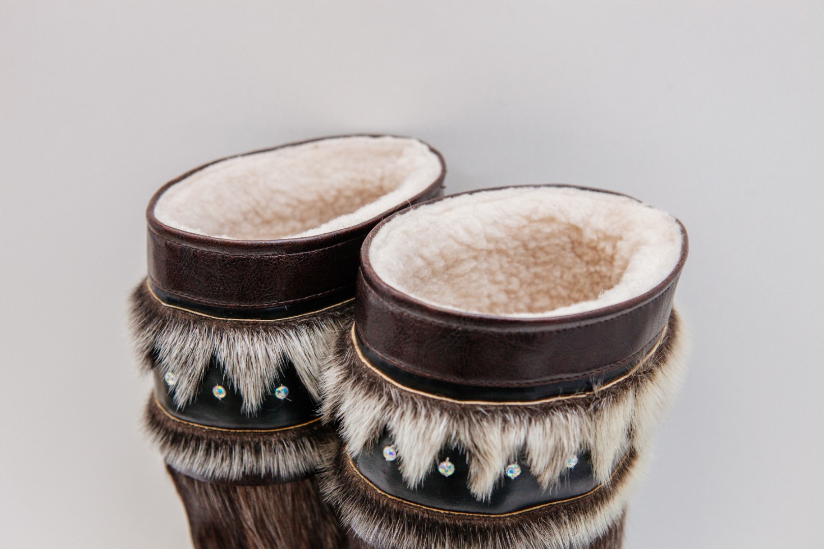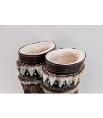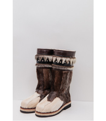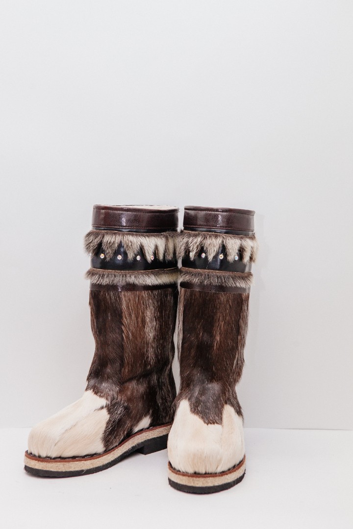 Унты из камуса северного оленя с кожаным ободком, вышитым ручным узором.